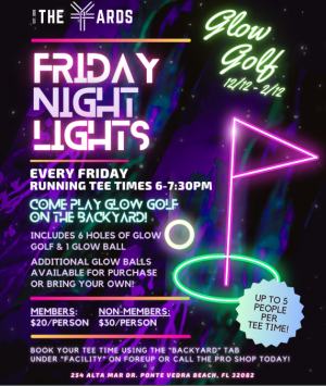 Come play glow golf on the backyard! Every Friday. Running tee times 6:00pm-7:30pm. Includes six holes of glow golf and one golf ...